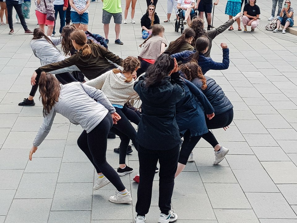 We absolutely loved dancing our Migration Dance Mob with wonderful students from Meadowhead School in Sheffield on Tuesday 21st June. Working with some of our dancers, the students created a moving 7 mins piece inspired by our latest production, Clorinda Agonistes. They performed it in the glorious sunshine of Barker’s Pool in the centre of Sheffield to an audience of over 100 people, friends and families and passers by. Some of the public even took part in a small workshop delivered with the students and teaching some of the choreography of the work they created!