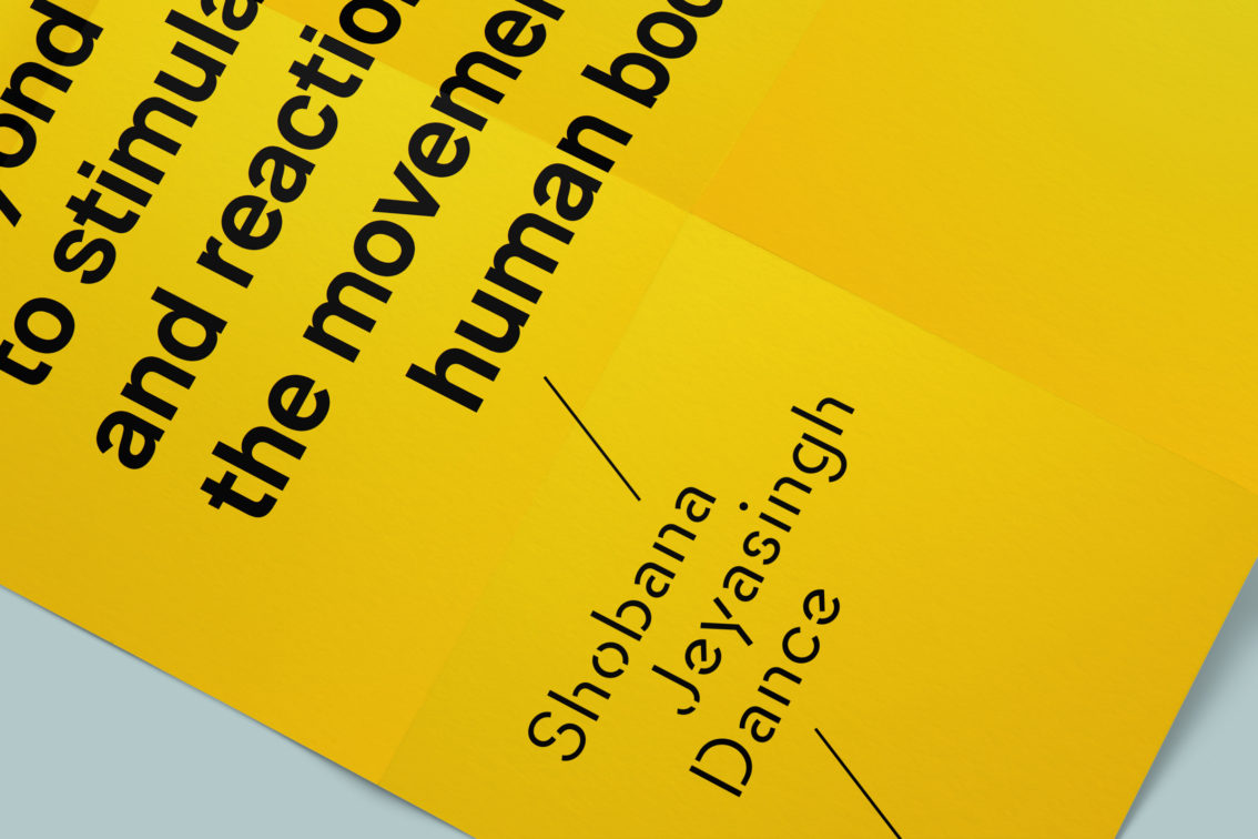 We use colour sparingly and a neutral typeface, so that our performance is always the hero. Our brand is active, and builds on the narrative within the works. Confident, elegant, precise and distinctive. All words that are equally applicable to Shobana’s body of work.